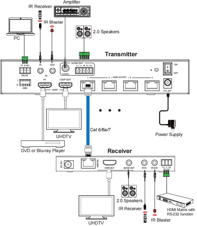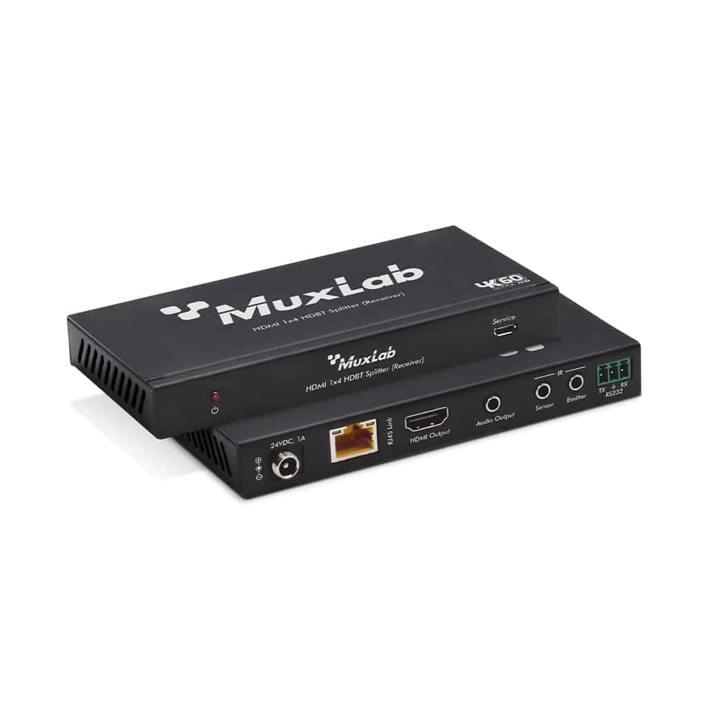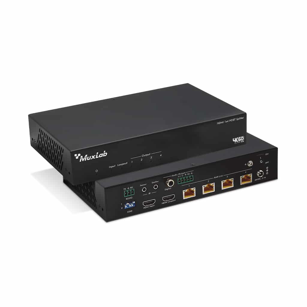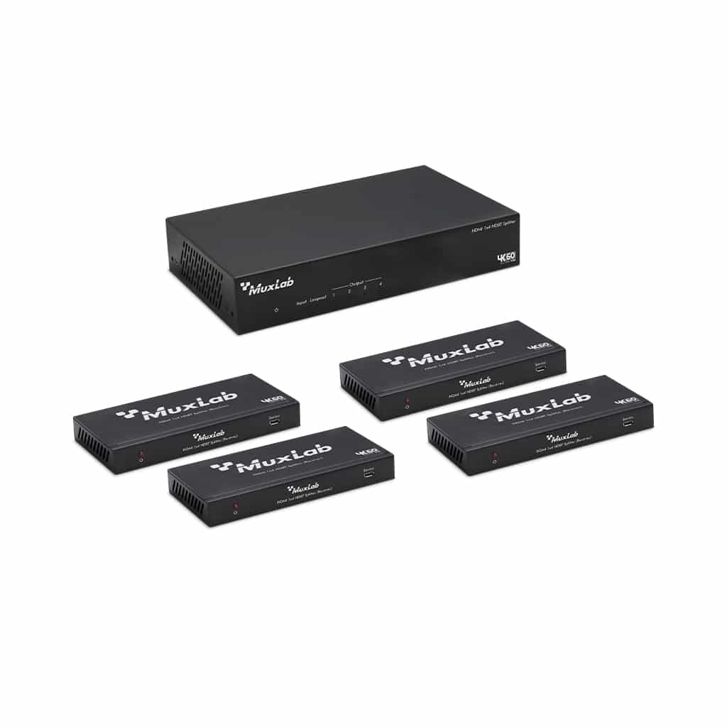 The HDMI 1×4 HDBT Splitter Extender Kit 120m, 4K/60 support IR and RS232 signal pass-through, audio de-imbeddeding function and advance EDID management.