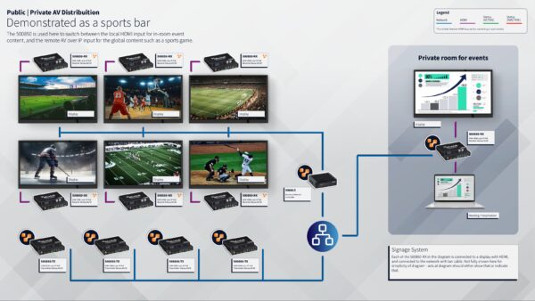 The KVM HDMI over IP PoE Extender Deluxe, 4K/30 allows HDMI & USB equipment to be connected up to 330ft (100m) over an Ethernet LAN, supports HDMI up to 4K @ 30Hz (4:4:4)and 4K @ 60Hz (4:2:0) via Cat5e/6 cable in multiple point-to-point and point-to-multipoint configurations. The Transmitter (500850-TX) and Receiver (500850-RX) support PoE (PD) if used with a PoE (PSE) Ethernet Switch.