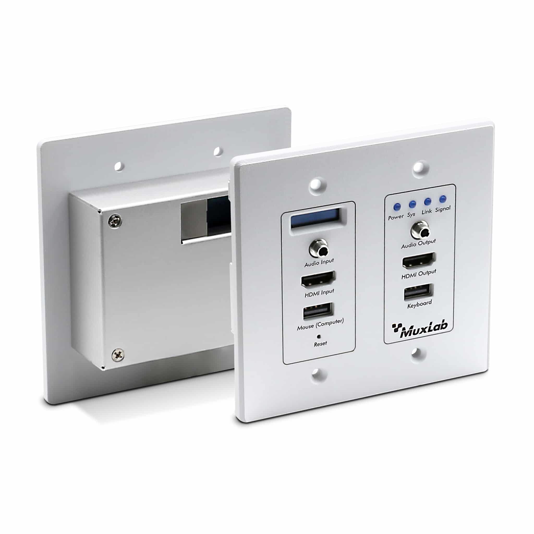 The HDMI over IP PoE Wall-Plate Seamless Transceiver, 4K/30 (model: 500865-WP-WH) allows HDMI source equipment to be extended locally up to 330ft (100m) at up to 4K @ 30Hz resolution via Cat5e/6 cable and is compatible with the MuxLab 500860 and 500861 Transceivers to support point-to-point, point-to-multipoint and multipoint-to-multipoint configurations, Video Wall and Multiview capabilities in a low bandwidth expandable and cost effective manner, without the need to install dedicated cabling systems. The exceptionally low bandwidth requirements of this device combination allows for streaming audio/video content over a local network, over WiFi, and over the Internet for distributed installations spread throughout the globe. The Transceiver accepts a 4K video @ 30Hz and streams the content to an H.264/H.265 Receiver to be displayed on a 4K monitor. The device supports PoE (PD) and may be powered by a PoE (PSE) Ethernet Switch.