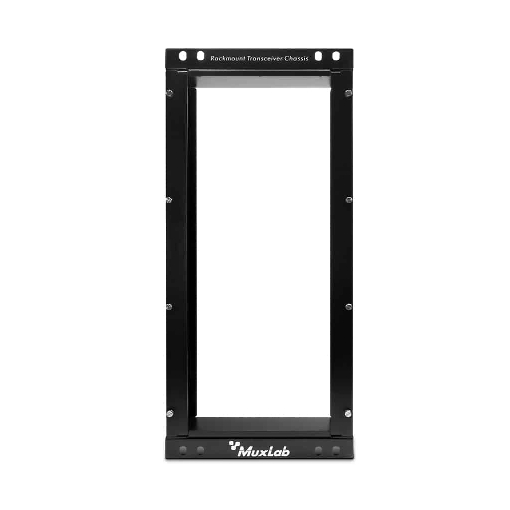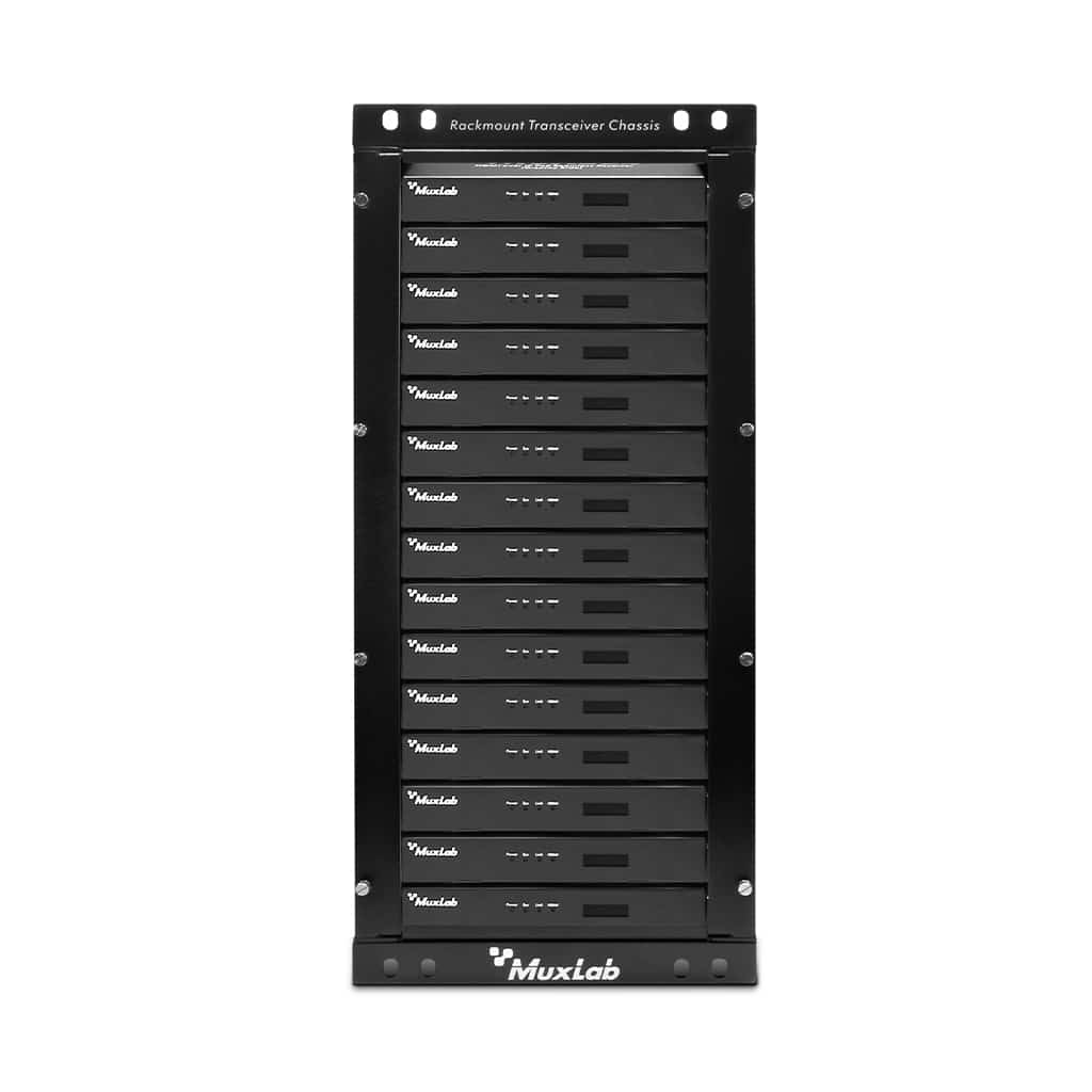 The 14 Port Rackmount Transceiver Chassis 4.5U (model: 500926) is designed as a head-end cable management solution, allowing any combination of up to fourteen (14) MuxLab Transceivers to be installed in a standard 19” telecom relay rack. Head-end AV equipment such as DVD players, video servers and cable boxes may be installed in a local wiring closet and connected to the Cat5e/6 structured cabling system via a wide array of MuxLab Transceiver solutions. The Transceiver may be installed in either front or rear facing orientation depending on the application.